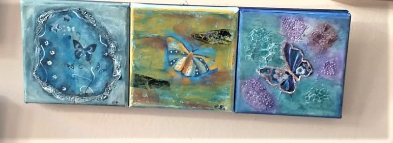 Τρείς μικροί καμβάδες ένας εικαστικός πίνακας mixed media ” butterflies ”