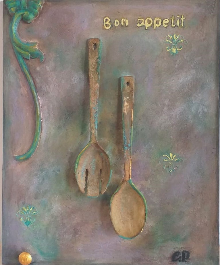 MDF wood, 3d element from pressed paper, plastic spoon and fork, colors and processing with Powertex materials.