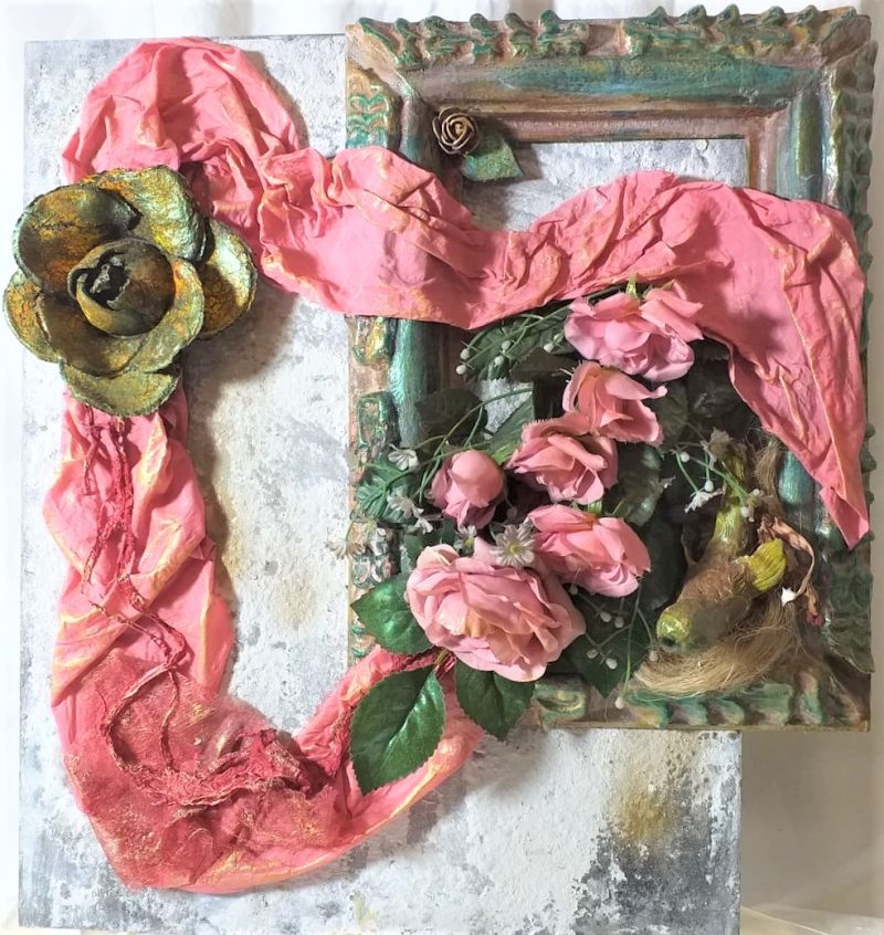 In a wooden panel they compose Spring, synthetic flowers, clay flowers, frame made of pressed paper, fabrics and threads.